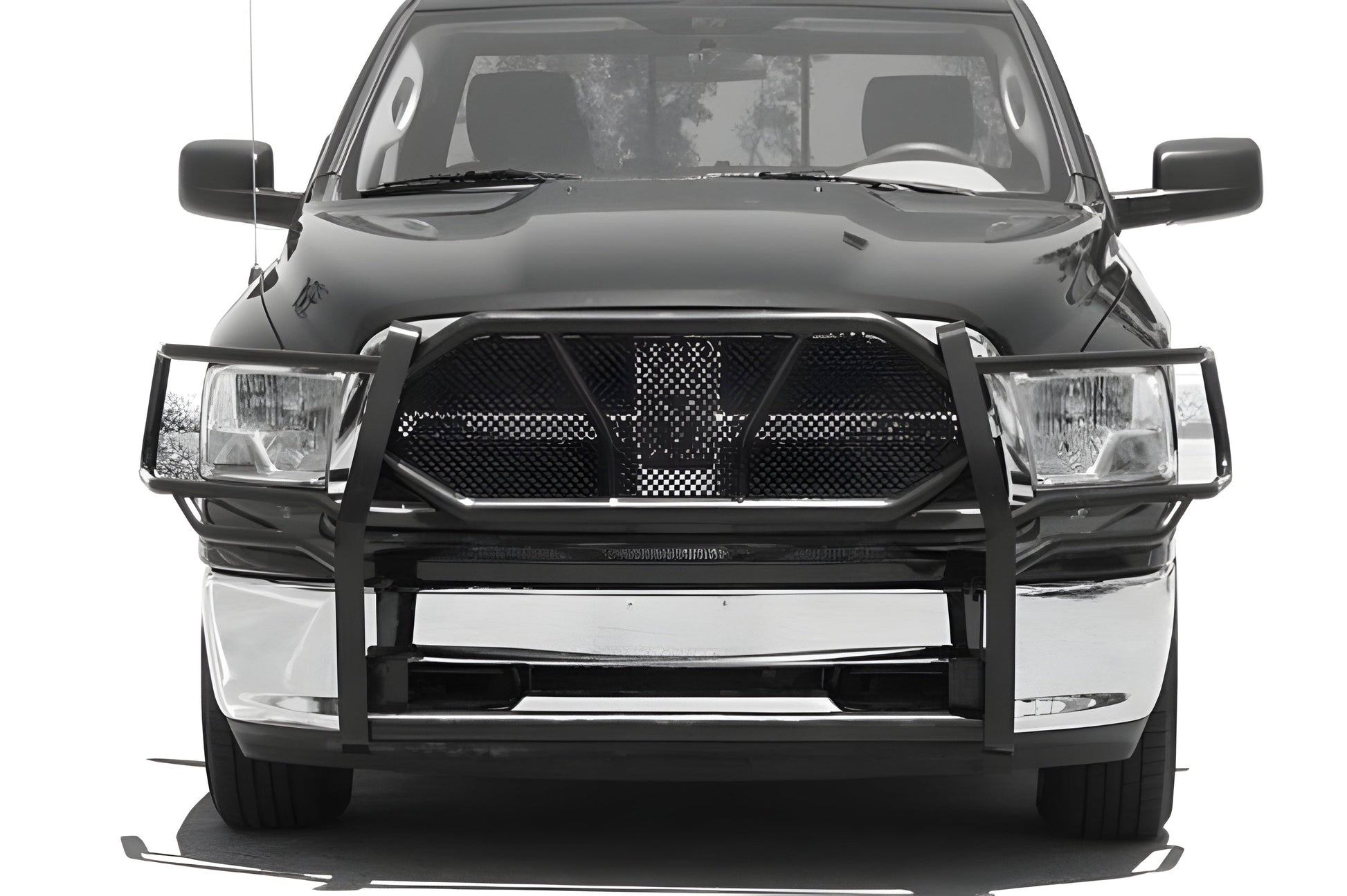 A: Constructed from high-strength steel with a black powder-coated finish, this grille guard offers durability and long-lasting performance. The direct bolt-on installation ensures easy setup, providing added protection and a bold appearance for your Ram 1500.