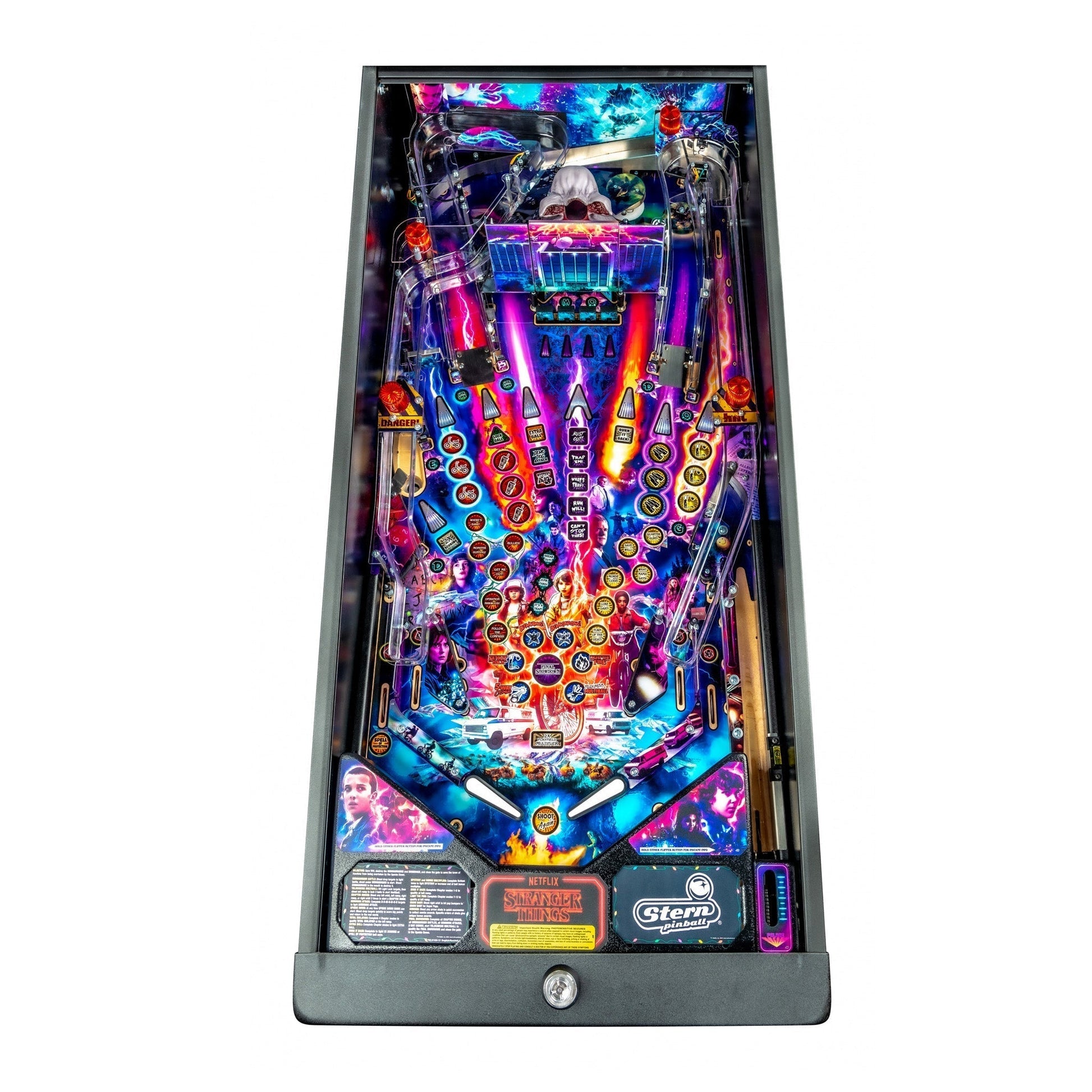 Experience the terrifying forces in Hawkins, Indiana that turn this small town “upside down” with supernatural elements, strange sightings, and government secrets. Stranger Things pinball machines will immerse players in a search to unravel the extraordinary mysteries and secret government experiments taking place at the Hawkins National Laboratory. The gameplay focuses on unlocking the hidden meanings of supernatural events occurring in and around the town, including the appearance of a girl known as “Eleven” with telekinetic abilities. The ball is wild as Mike, Lucas, Dustin, Will, Joyce, and Police Chief Jim Hopper help Eleven close the dimensional gate.