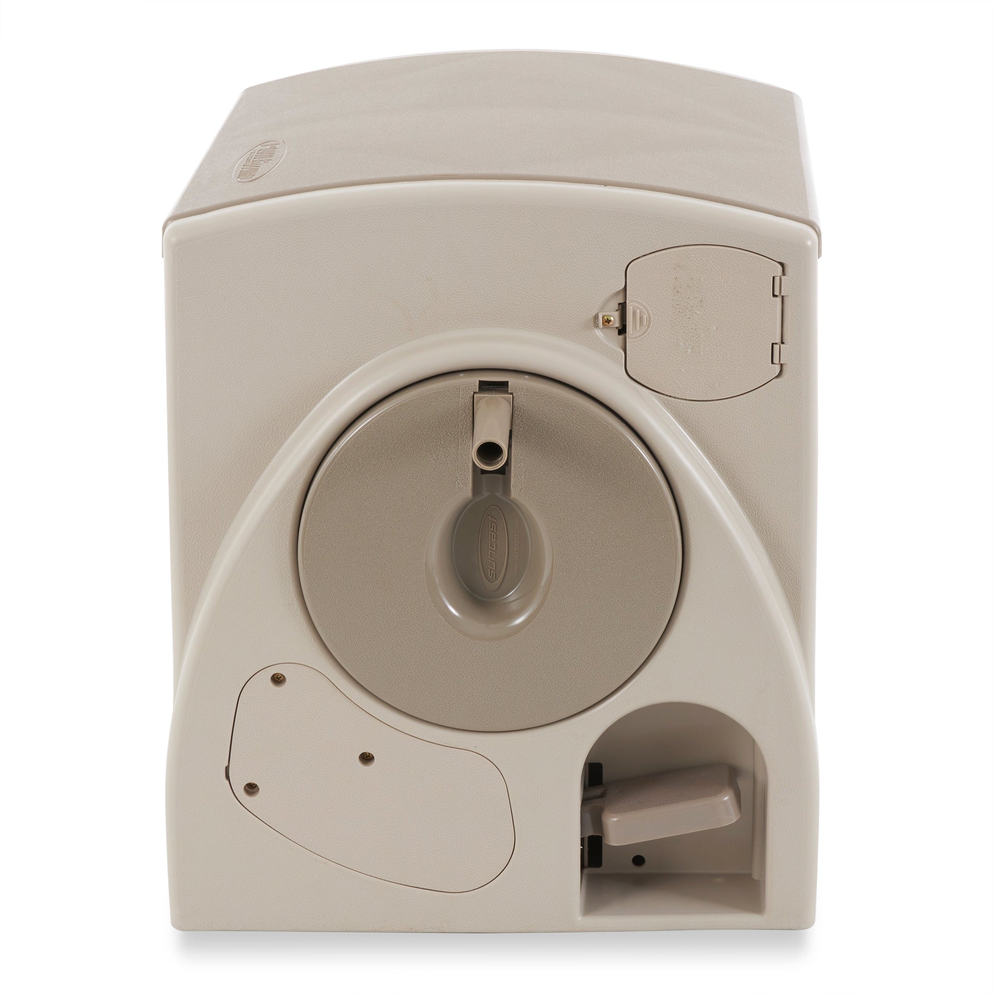 A: The reel is constructed from durable resin with a taupe color, designed to withstand the elements and offer long-lasting performance.
