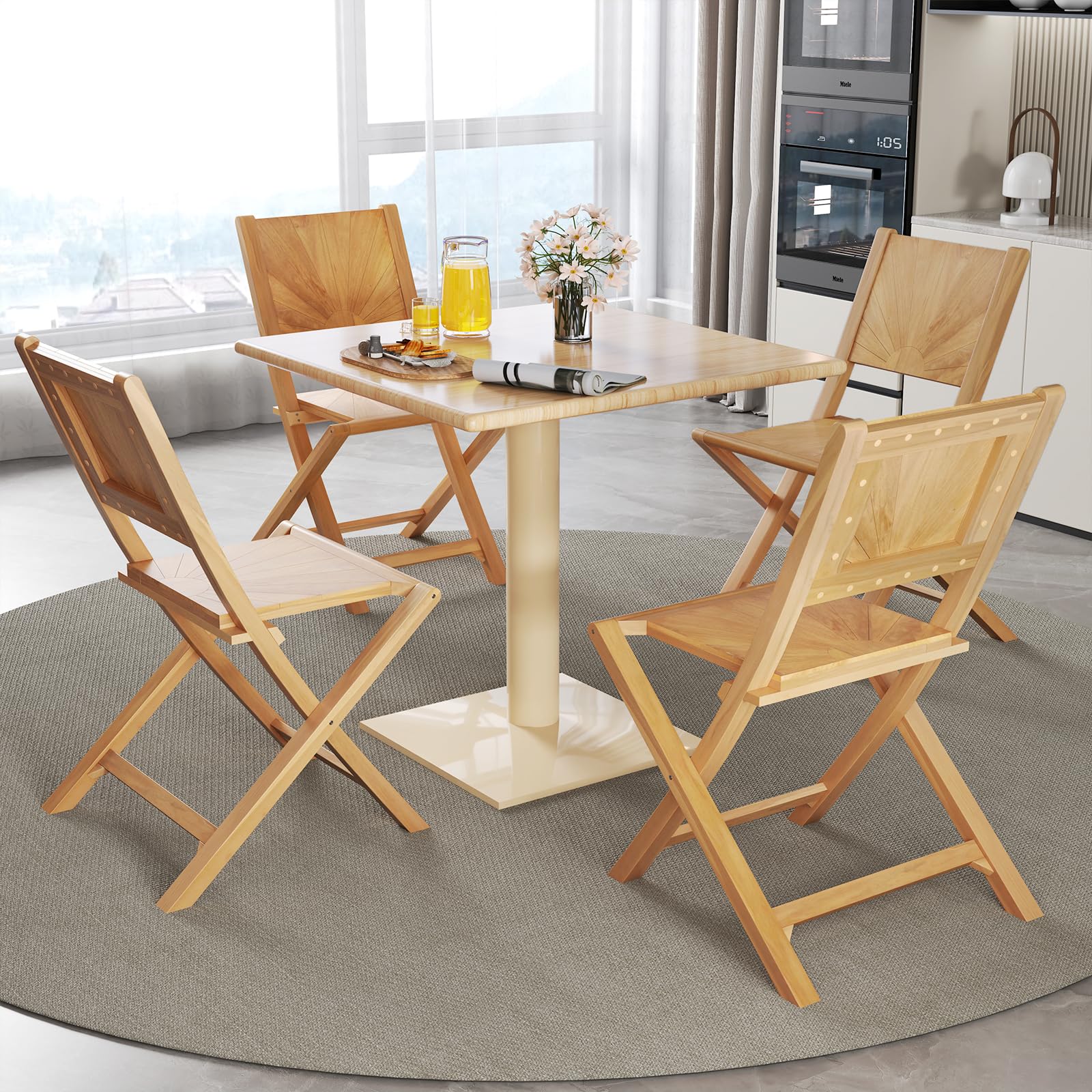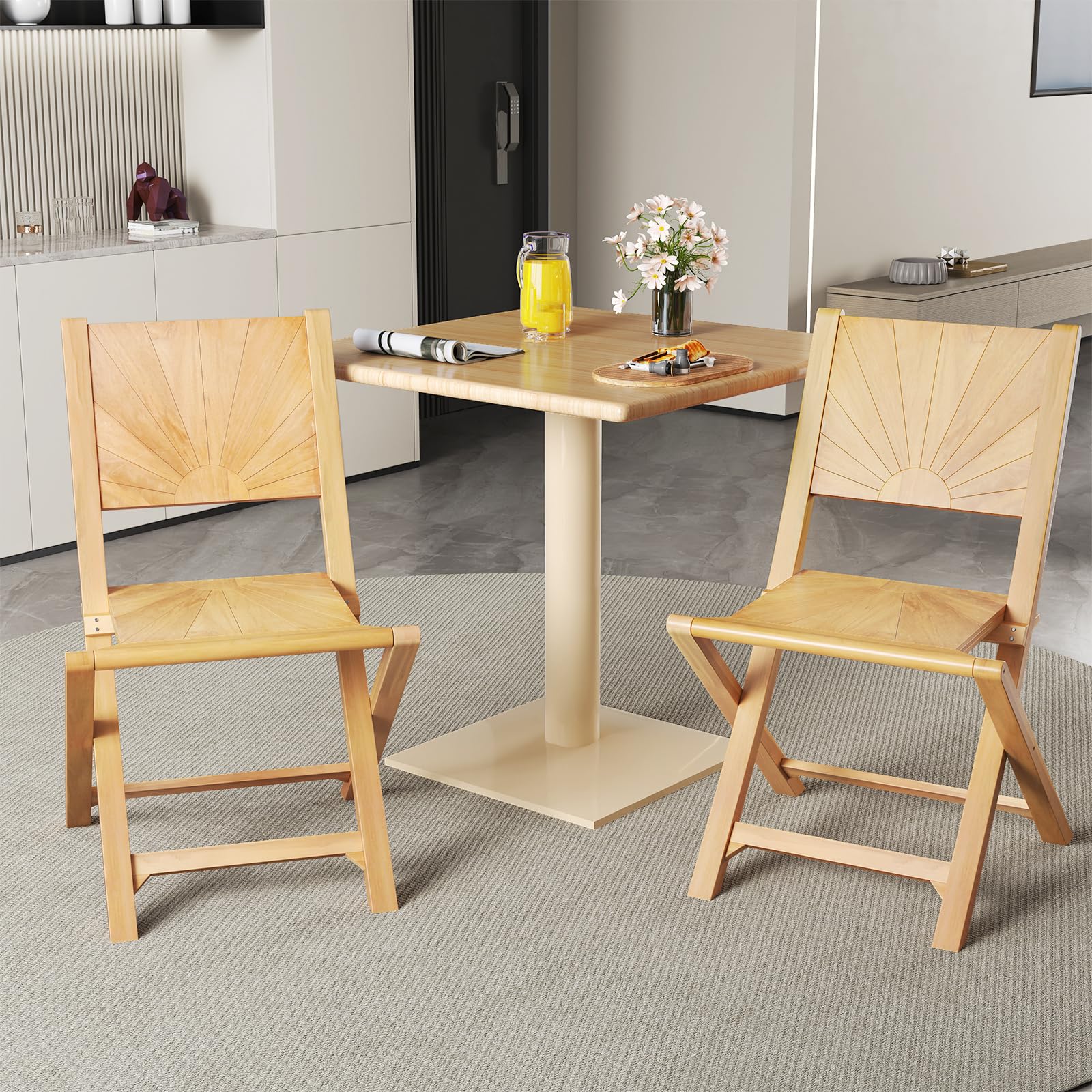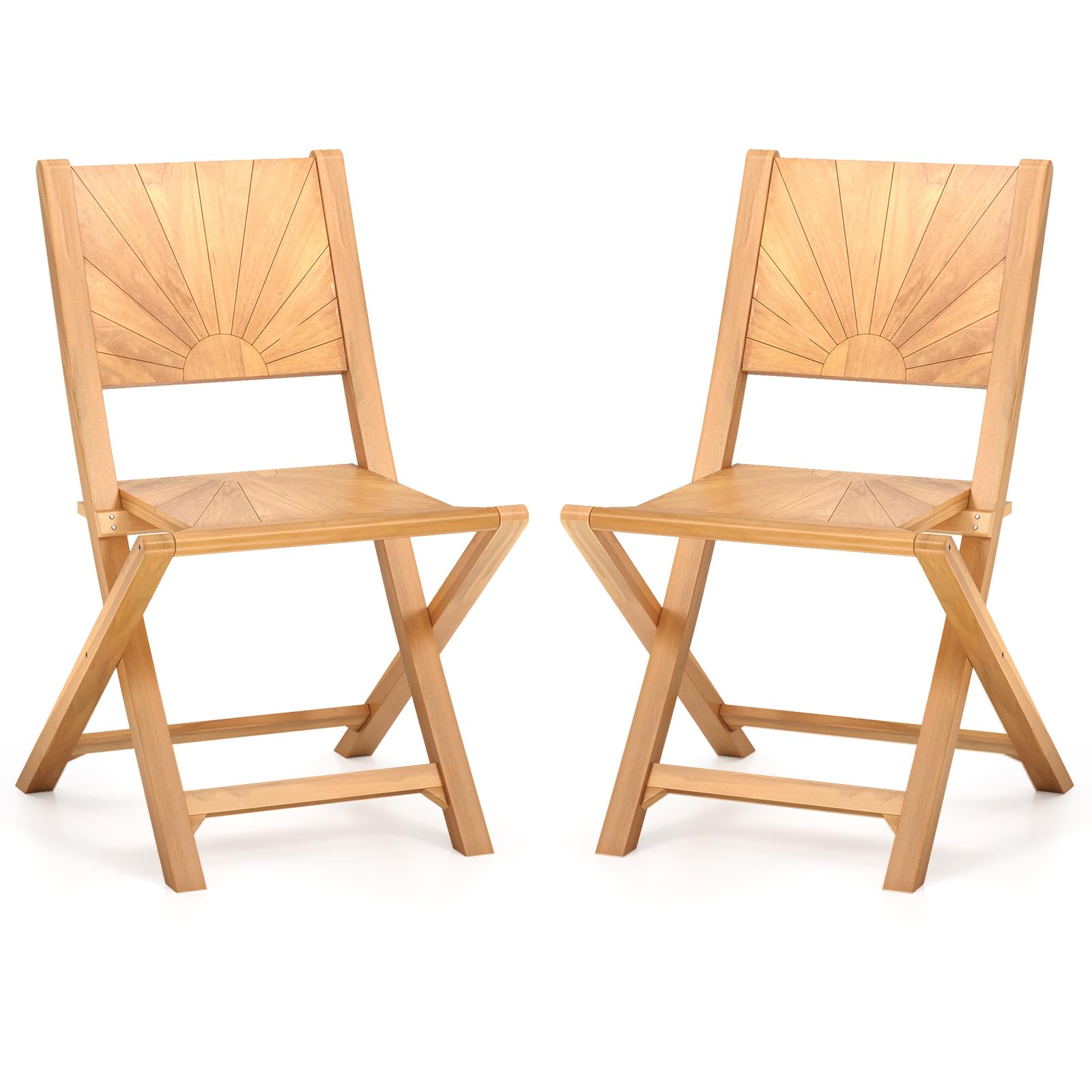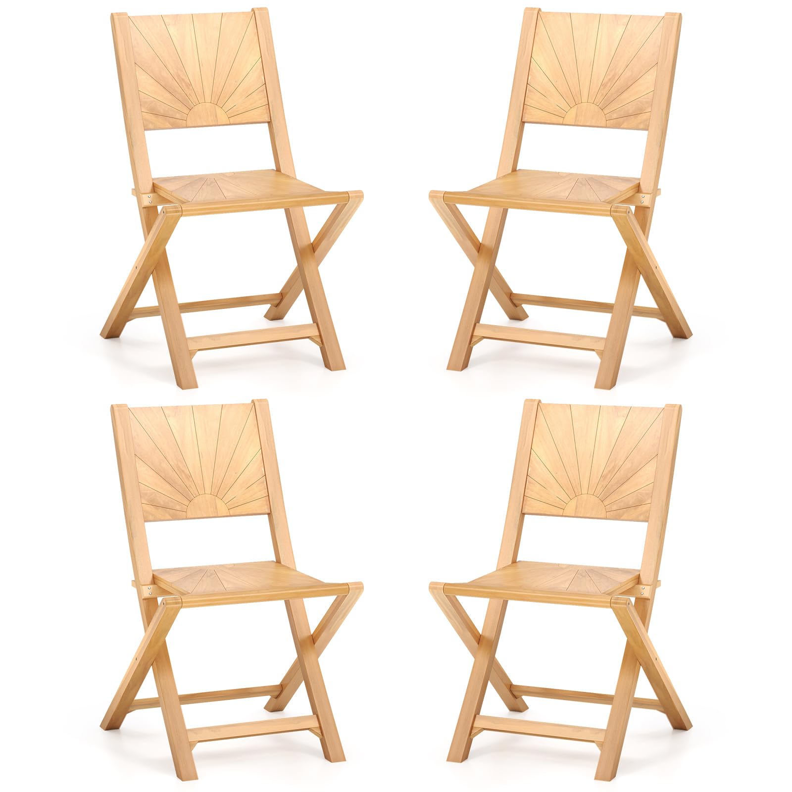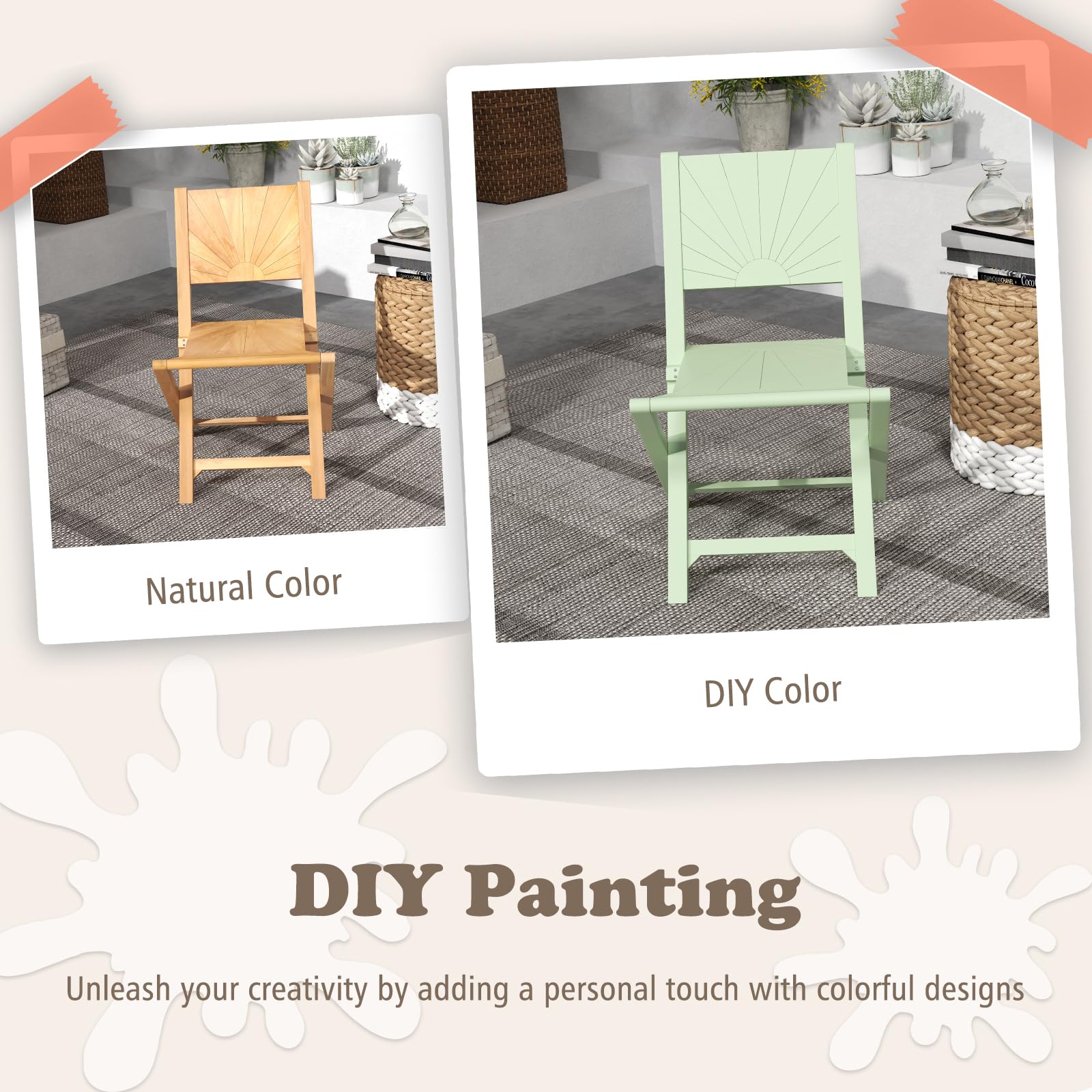 Beautifully crafted from solid teak with a splinter-free finish, these outdoor dining chairs boast natural beauty and exceptional durability. The smart foldable design allows for easy storage and optimal convenience. Moreover, the 105° inclined backrest ensures maximum comfort during your relaxation. These portable chairs’ natural colors can be transformed into colorful designs by DIY painting. Perfect for any porch, balcony or garden, these wood folding chairs combine elegance and practicality in one.