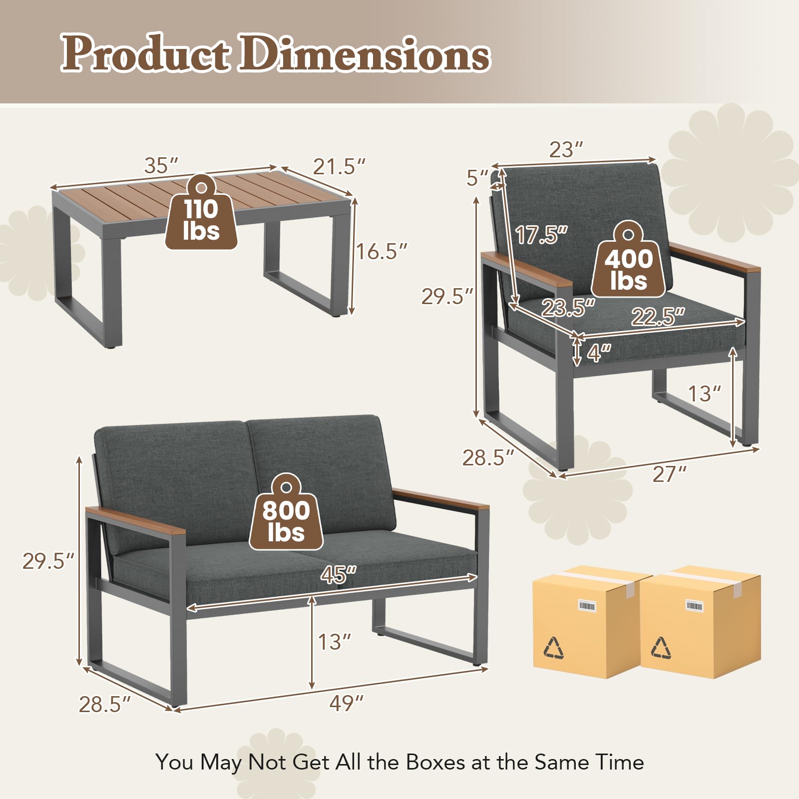 Each piece of this outdoor sofa set features a robust rust-proof aluminum frame with adjustable footpads for unmatched stability, supporting up to 800 lbs on the loveseat and 400 lbs per armchair. The thick, soft cushions and inclined backrests ensure maximum comfort, while the wood-plastic tabletop and armrests offer a blend of elegance and longevity. Ideal for various arrangements, this set adapts seamlessly to your space and needs, whether itβs for gatherings or solitary relaxation, making it a perfect addition to any outdoor area.