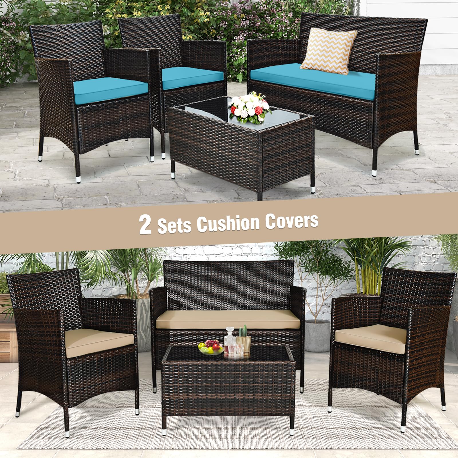 Durable Rattan Construction: The Tangkula 4-Piece Rattan Patio Furniture Set is made from high-quality, all-weather rattan, designed to endure outdoor conditions while maintaining its sleek, stylish appearance.