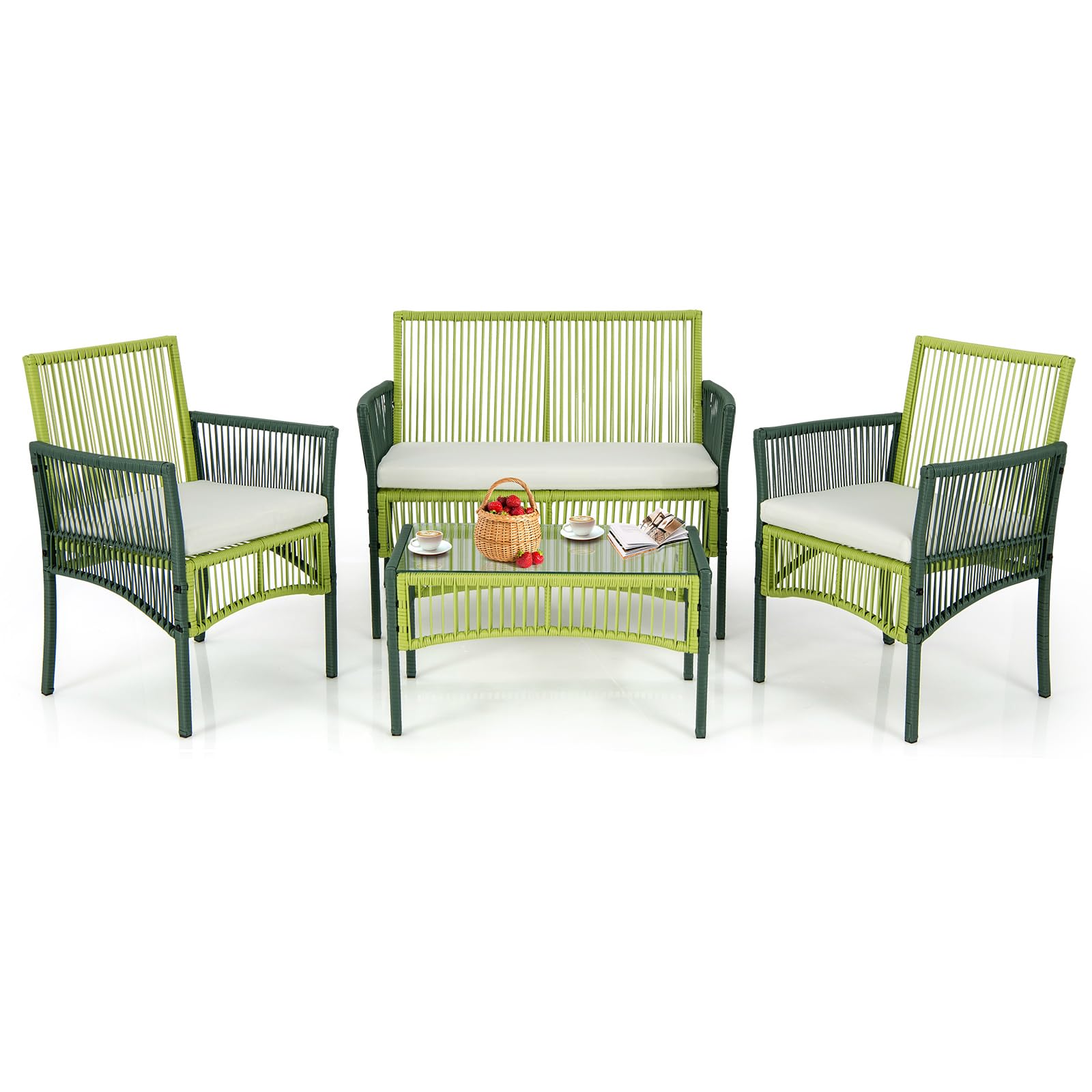 Durable Rattan Construction: The Tangkula 4-Piece Outdoor Rattan Chair Set is crafted with high-quality, weather-resistant rattan, making it ideal for outdoor use in various weather conditions.