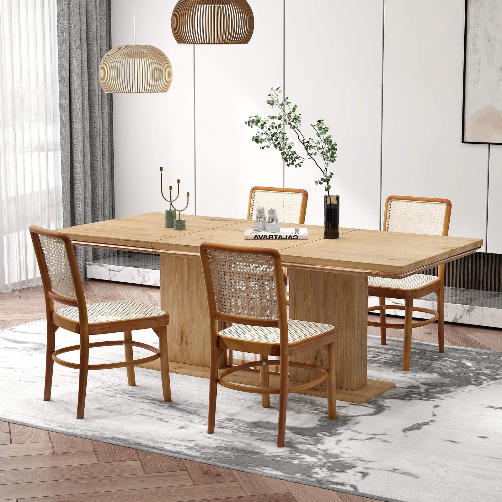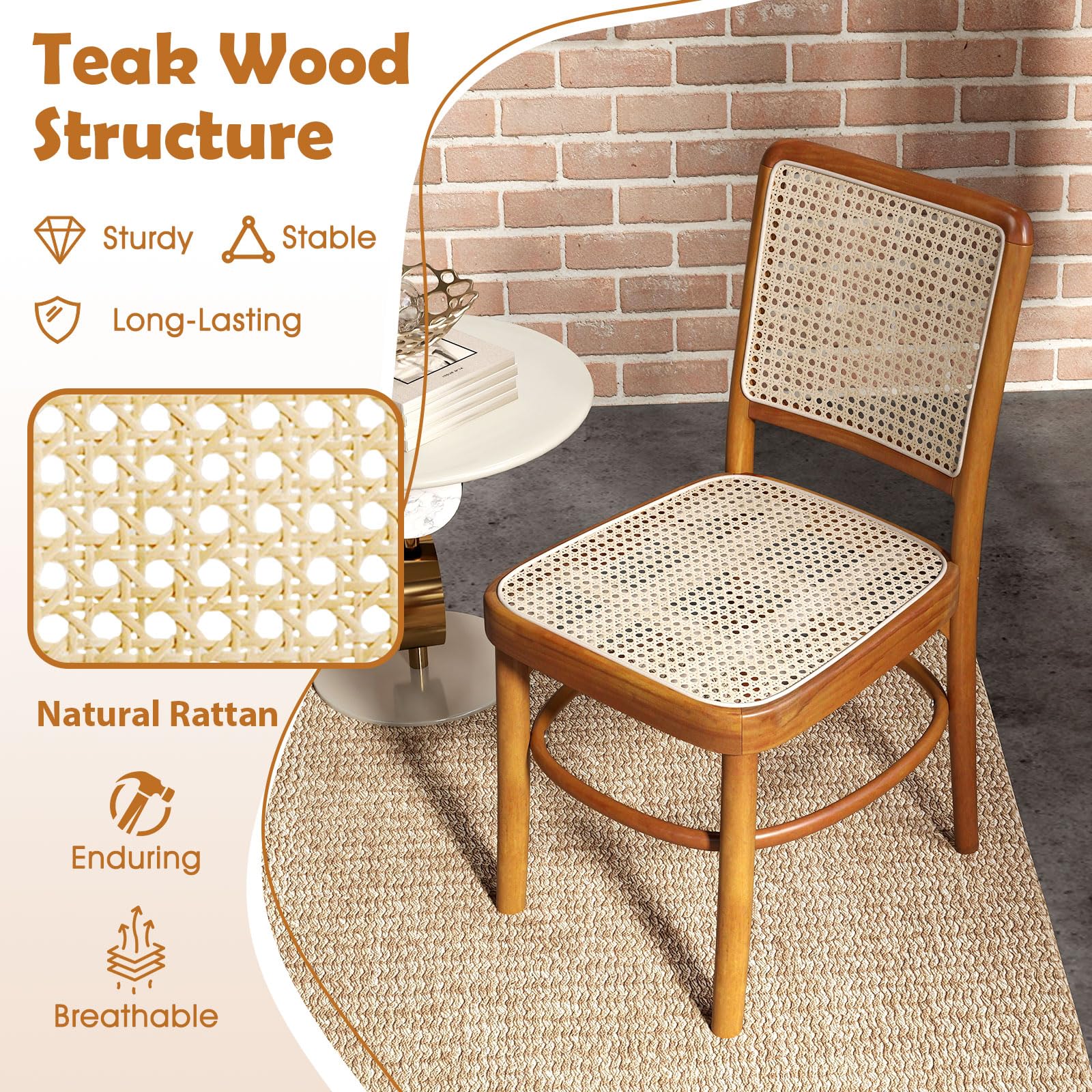 Elegant Boho Design: The Tangkula Boho Dining Chairs feature a beautifully handcrafted natural rattan seat and backrest, paired with a solid teak wood frame for a warm and inviting aesthetic that enhances any dining or living space.