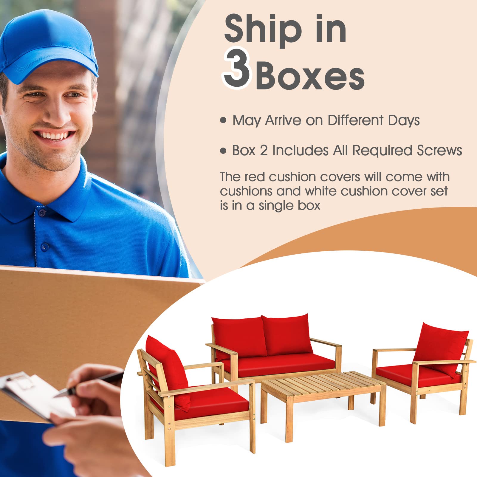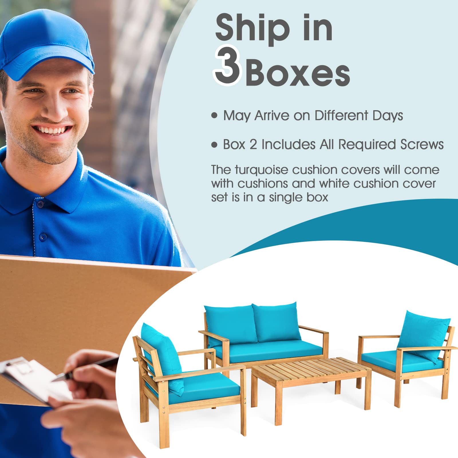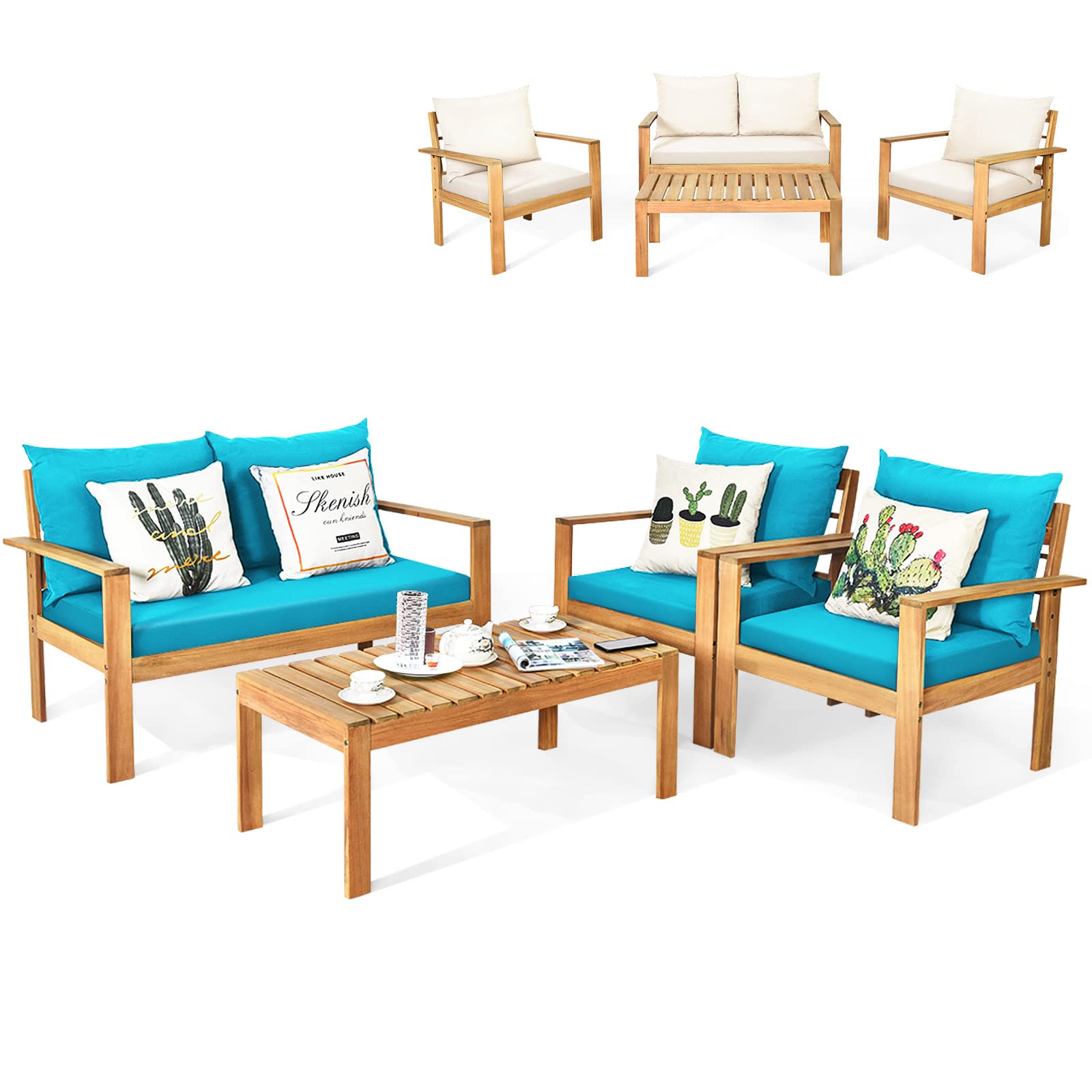 Comfortable and ergonomic design gives you a better sense of belonging. Made of premium acacia wood, this 4 pcs wood conversation sofa set features a uniform texture and smooth touching with long-time serving time. Thick cushions with fluffy filler make your sitting experience more comfortable. What's more, 2 sets water resistant cushion covers allow you to change your cushion colors according to the home decor from time to time. Lounging on the sofa under the warm sunshine, you will taste every cozy moment in your life.