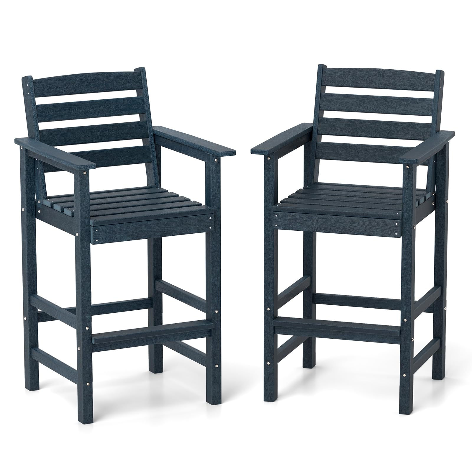 Discover ultimate outdoor comfort and timeless style with the Adirondack bar chairs. The 2/4 bar chairs are meticulously crafted from all-weather HDPE material and equipped with robust stainless steel screws, ensuring high stability and extended outdoor use. Each seat features a 105° inclined backrest, 3" wide armrests, and a 2.5" wide footrest, so you won't feel tired after long-time sitting. The faux wood texture and classic Adirondack design add an element of sophistication to any outdoor setting, making these high-top chairs perfect for use alongside 39.5" to 45.5" high bar tables. These 4 bar chairs with well-crafted details will elevate your outdoor spaces with both style and ease.