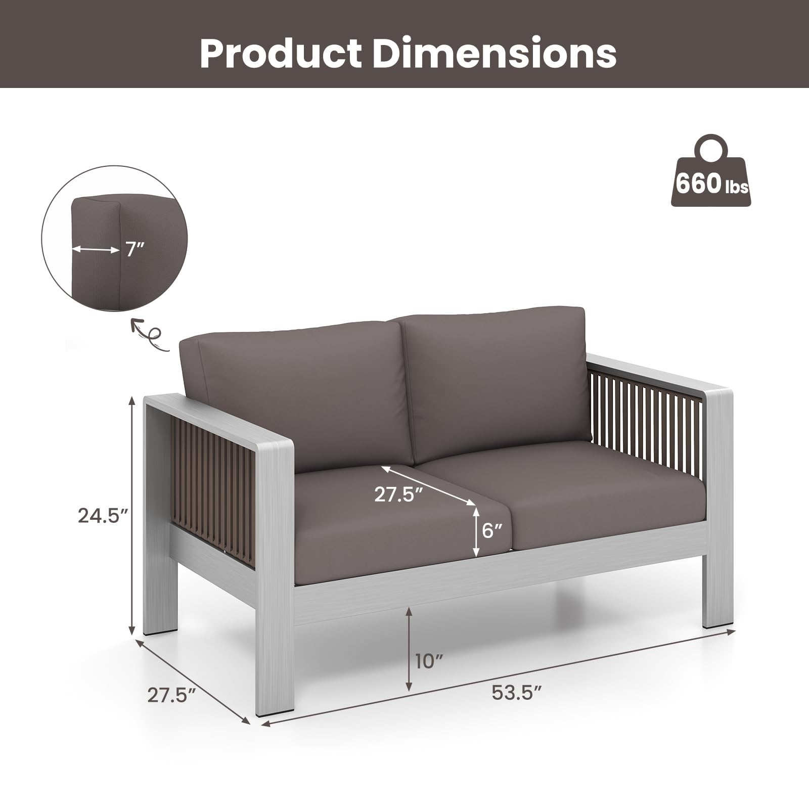 Durable Aluminum Frame: The Tangkula Patio Aluminum Loveseat Sofa is built with a sturdy aluminum frame, offering excellent durability and resistance to rust, ensuring long-lasting performance in outdoor settings.