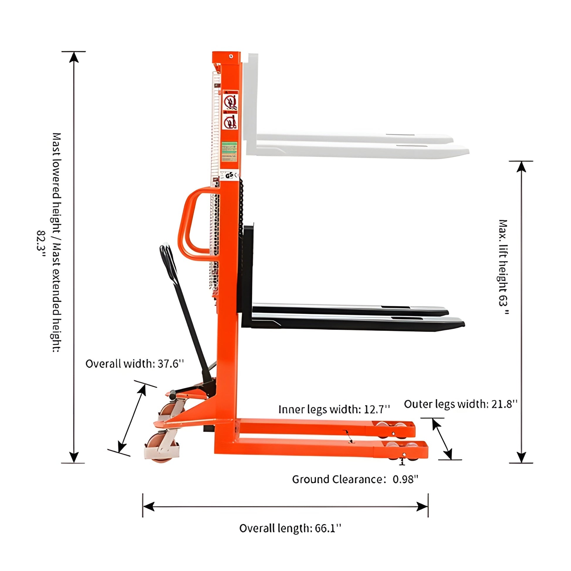 The Tory Carrier Manual Pallet Stacker is equipped with fixed legs and adjustable forged forks. The high efficient pumps makes the control easier to operate easier. This stacker has the load capacity of 2,200lbs, and the lifting height is 63".Β