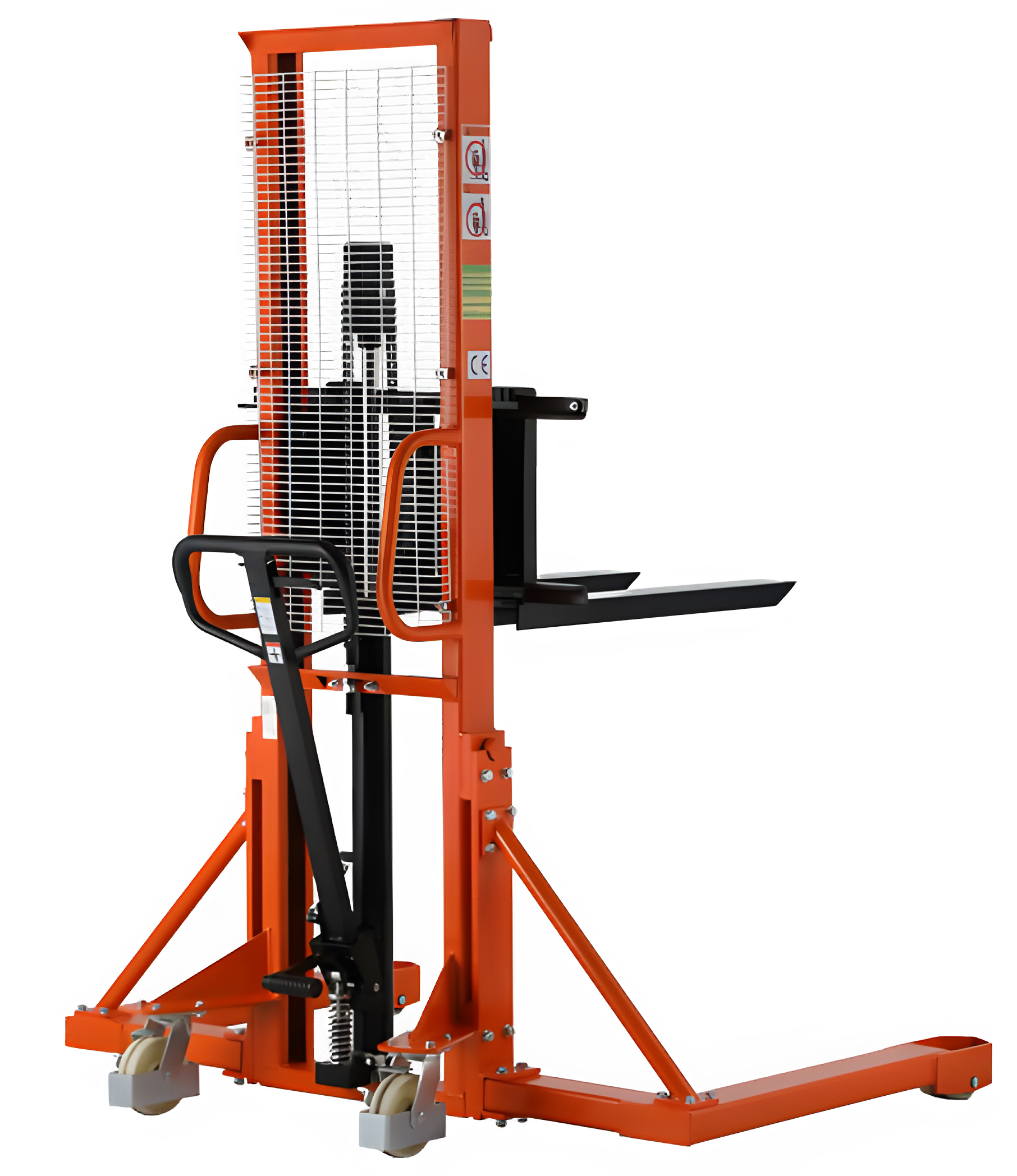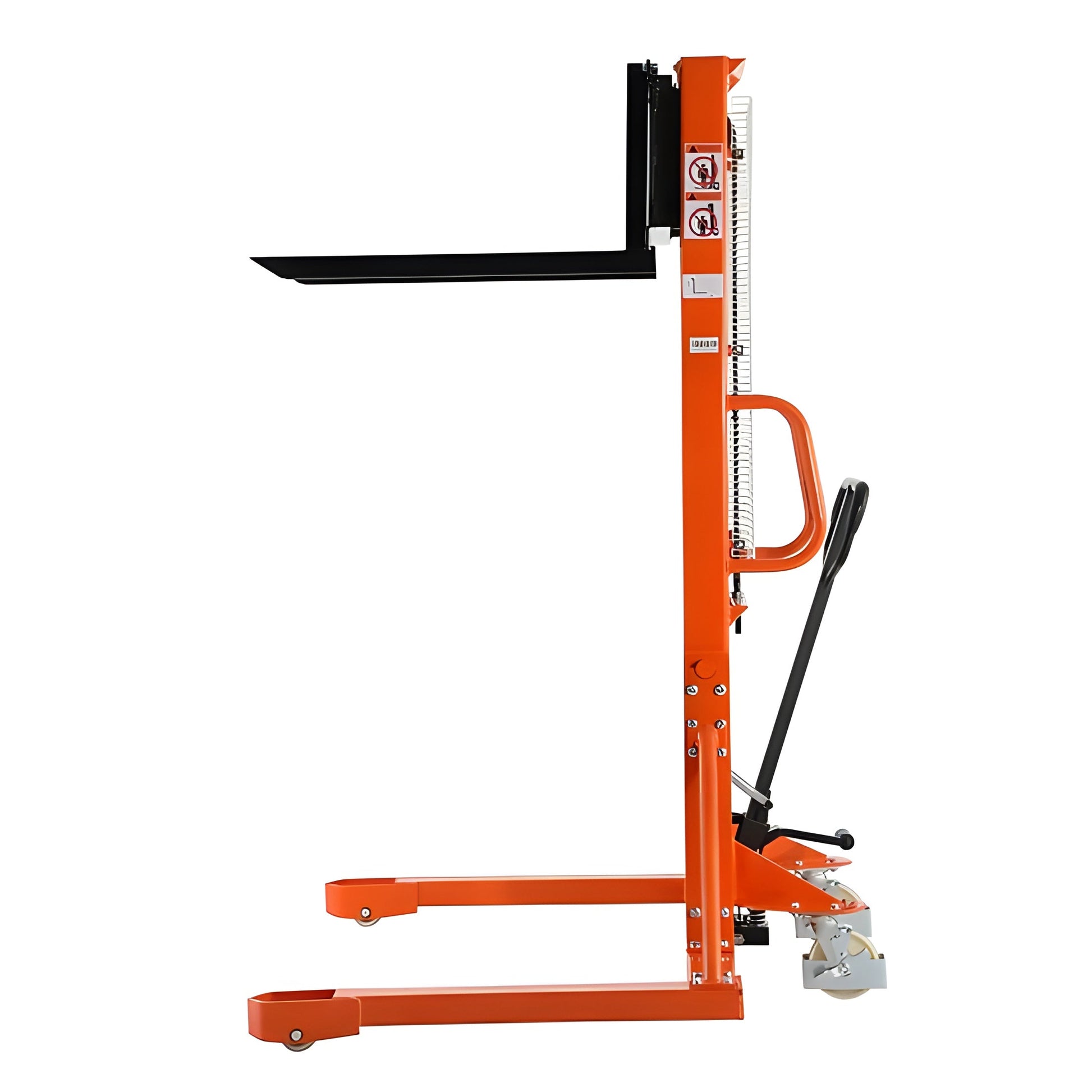 The Tory Carrier Manual Stacker is designed with straddle legs and adjustable forged forks. Foot and hand controlled lifting function allows the operator to work without having to perform extreme body movements. The manual stacker is rated for 1,100lbs and the lifting height is 63".