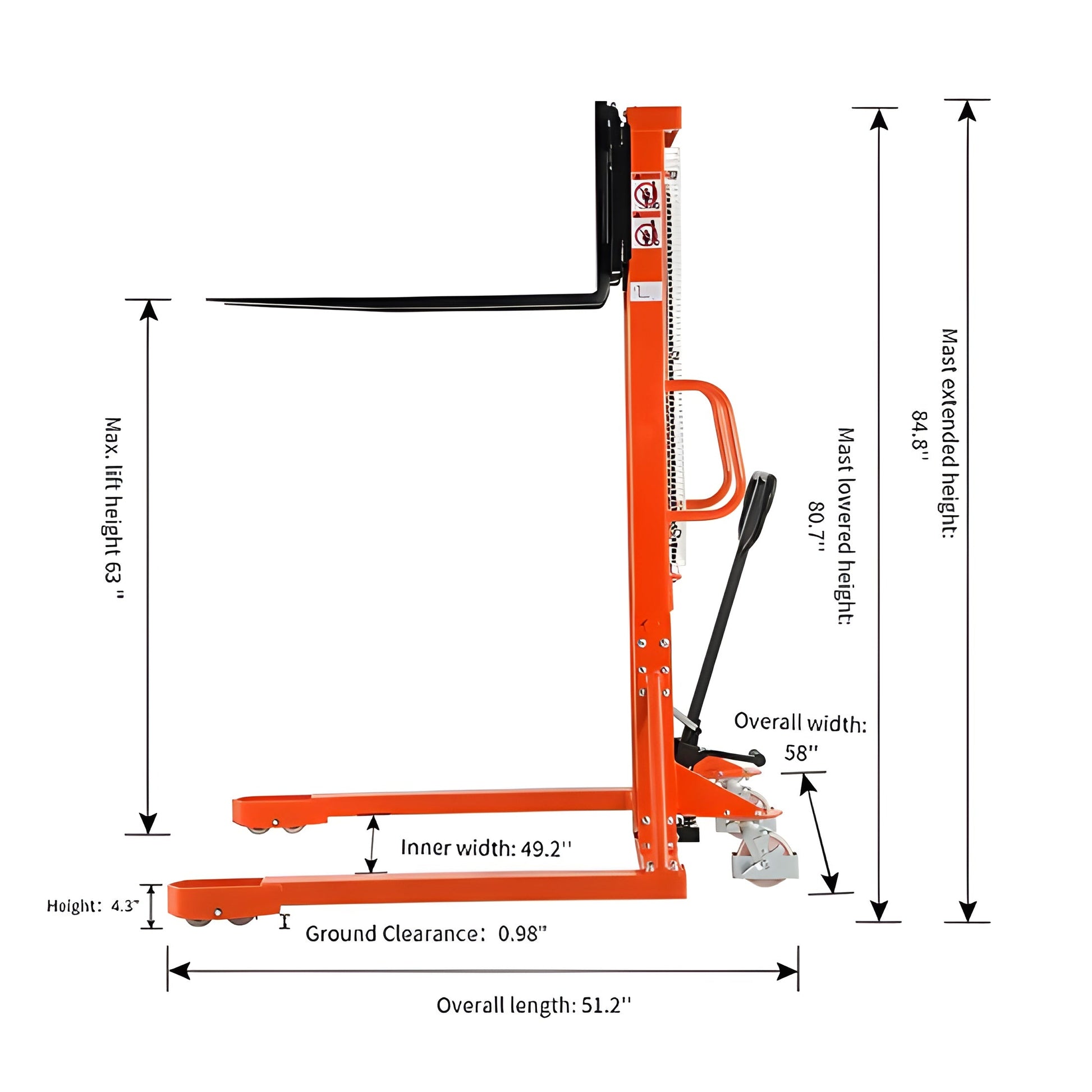 The Tory Carrier Manual Stacker is designed with straddle legs and adjustable forged forks. Foot and hand controlled lifting function allows the operator to work without having to perform extreme body movements. The manual stacker is rated for 2,200lbs and the lifting height is 63".