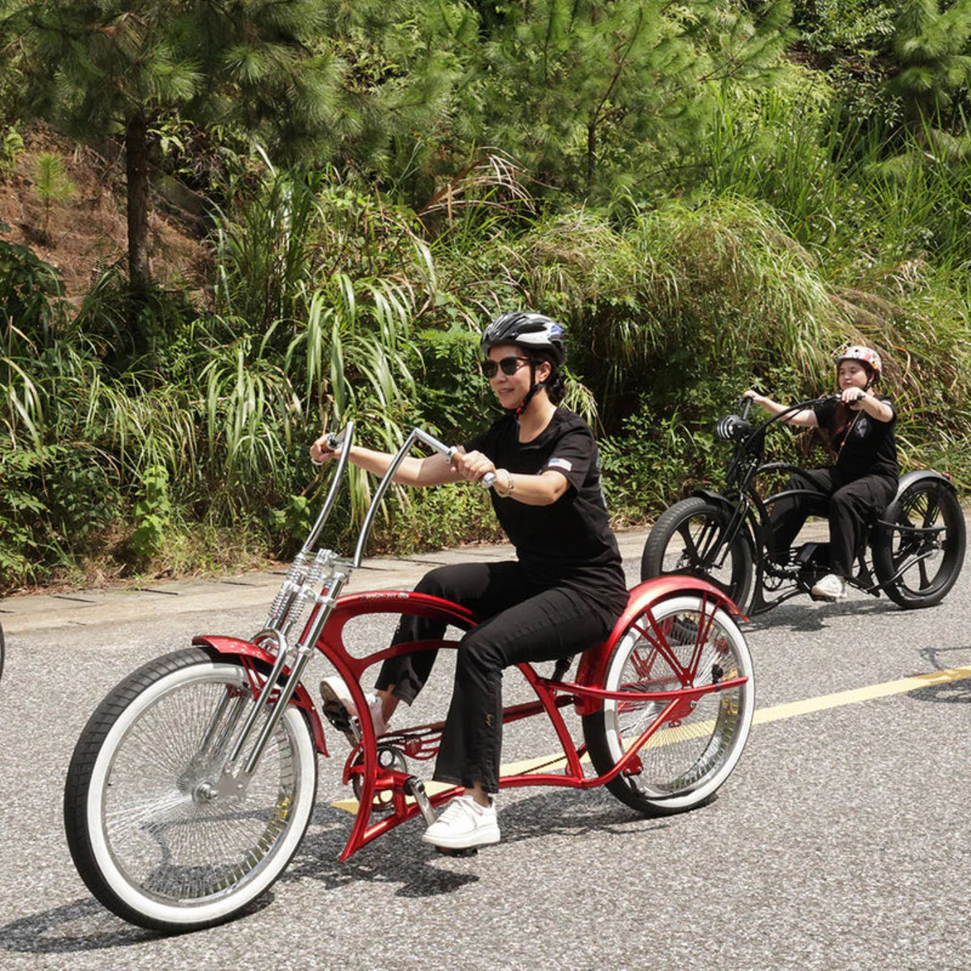 Comfort First: Features a wide saddle, high-rise handlebars, and extended frame geometry that promotes a comfortable, stretched-out riding experience for taller riders or anyone who enjoys cruising in style.