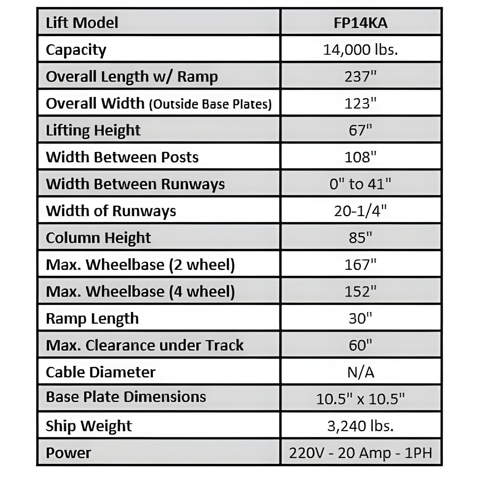 A: The FP14KA can lift vehicles up to 14,000 lbs, making it perfect for trucks, SUVs, and larger vehicles that need alignment or servicing.