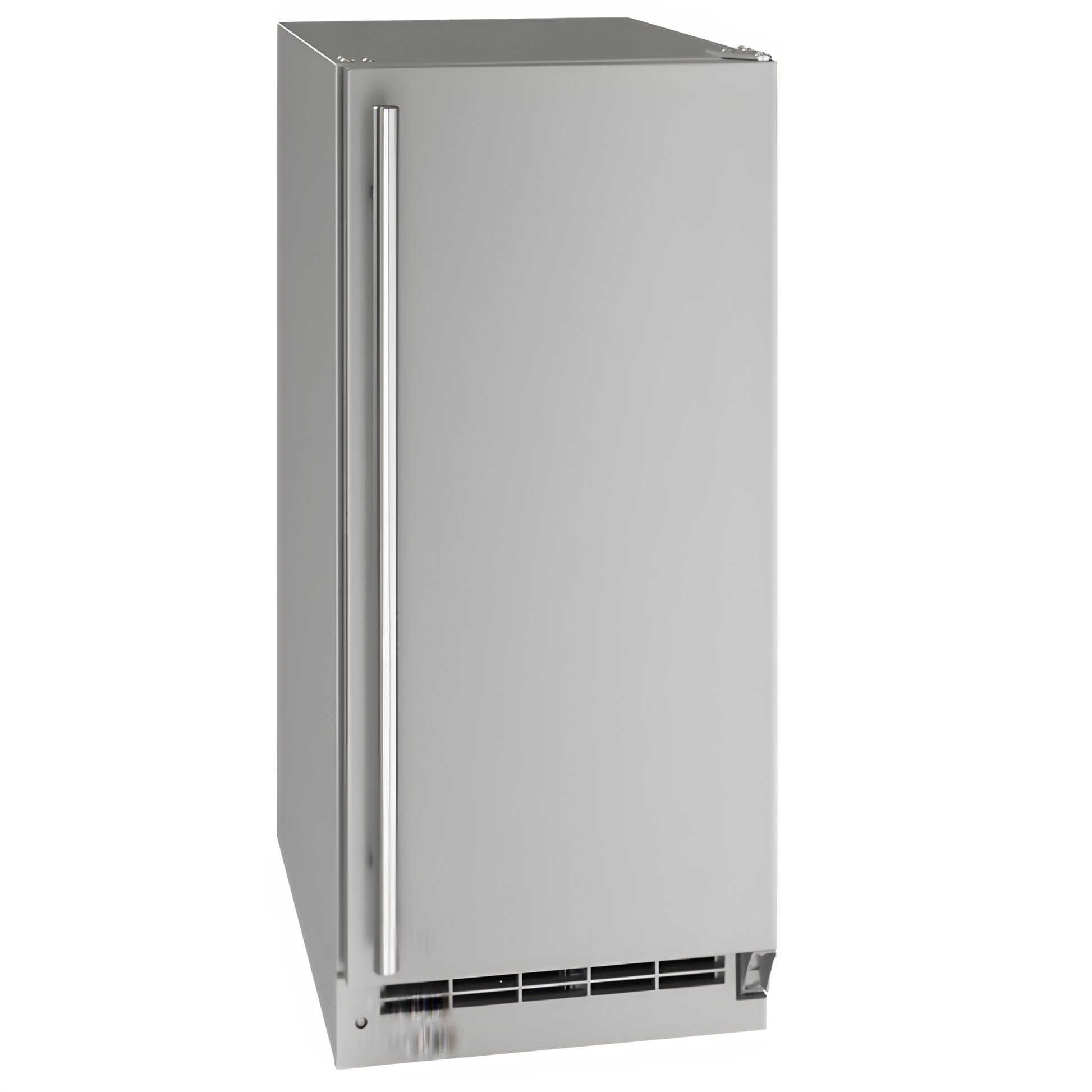 The U-Line 15" Outdoor Crescent Ice Maker offers exceptional performance, producing up to 25 lbs. of ice per day with a storage capacity of 25 lbs. This model requires no drain, making installation simple and convenient. The cabinet, toe-kick, and full-wrap door are elegantly finished in stainless steel, ensuring durability and a sleek appearance. Perfect for outdoor kitchens or bars, this ice maker is a reliable and stylish addition to any outdoor space.