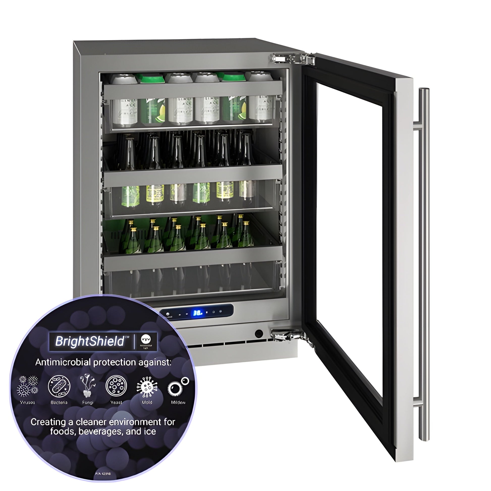 • UV-Protected Glass Door – Stainless steel frame with tinted glass for style and protection.