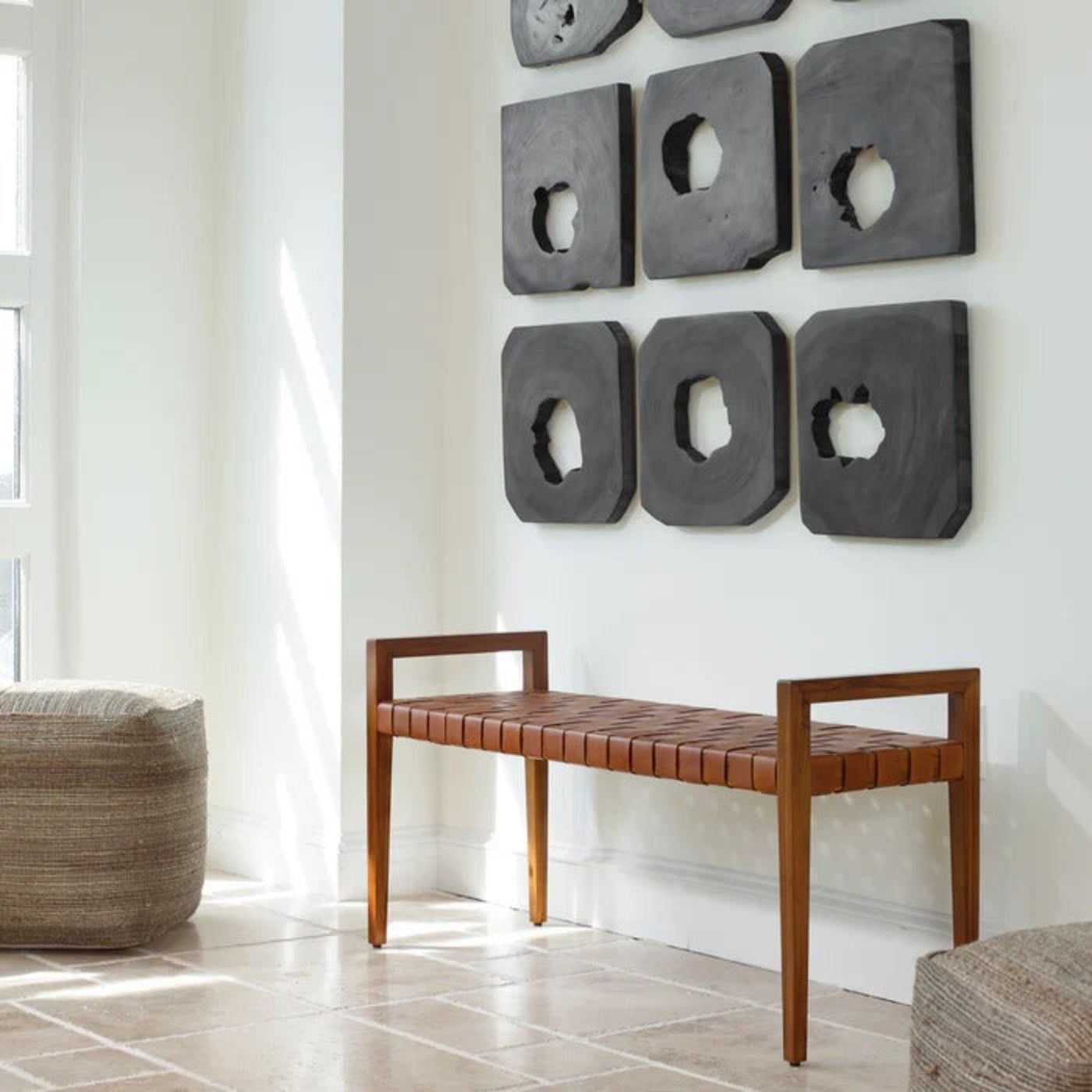 A: A mid-century–inspired accent bench with a seat made of genuine cognac leather straps woven in a basket-weave pattern, supported by a solid teak wood frame.