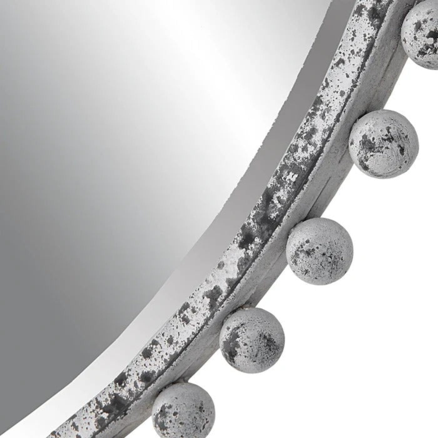This round frame features petite iron spheres lining the outer edge and is finished in a heavily distressed aged white with rustic black undertones. Mirror has a 1 1/4" bevel and is part of Uttermost's high-style wall mirrors, engineered and packaged for shipping.