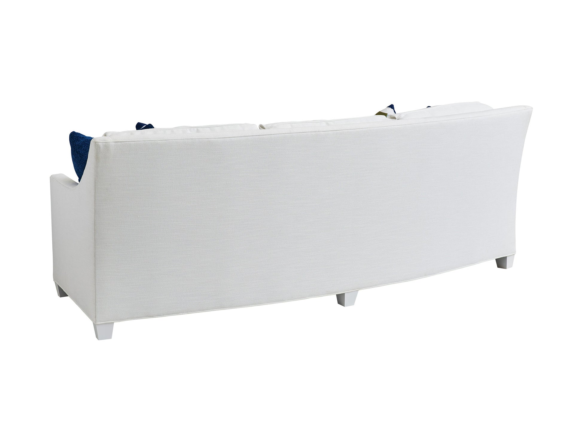 The Valenza Luxe Curved Sofa is a statement piece that embodies modern luxury. Designed by Lexington as part of the Ariana collection, this 99-inch sofa features a graceful concave silhouette, sloping track arms, and a hand-glazed platinum finish. Elegant silver accents, including burnished silver leaf and polished silver marble with taupe and gray veining, enhance its sophisticated appeal.