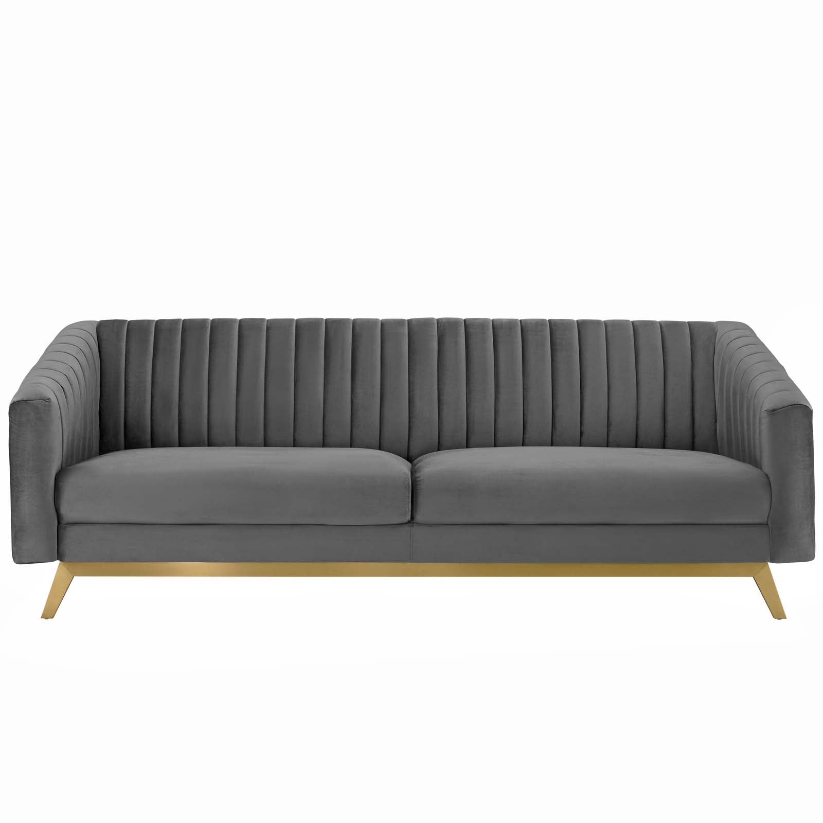 Harness the visual appeal of linear elements with the Valiant Performance Velvet Sofa. Interior vertical channel tufting creates a directed flow that adds depth to your retro modern living room, lounge room, or home office. Each subtle retro modern accent swirls together for an organically designed piece that provides both decor appeal and premium comfort. Soft, stain-resistant performance velvet upholstery covers an individually-wrapped pocket coil support system encased in dense foam padding for a luxurious seating experience. The Valiant upholstered velvet sofa rests securely on four splayed and tapered gold stainless steel legs with non-marking foot caps and can support up to 900 lbs.