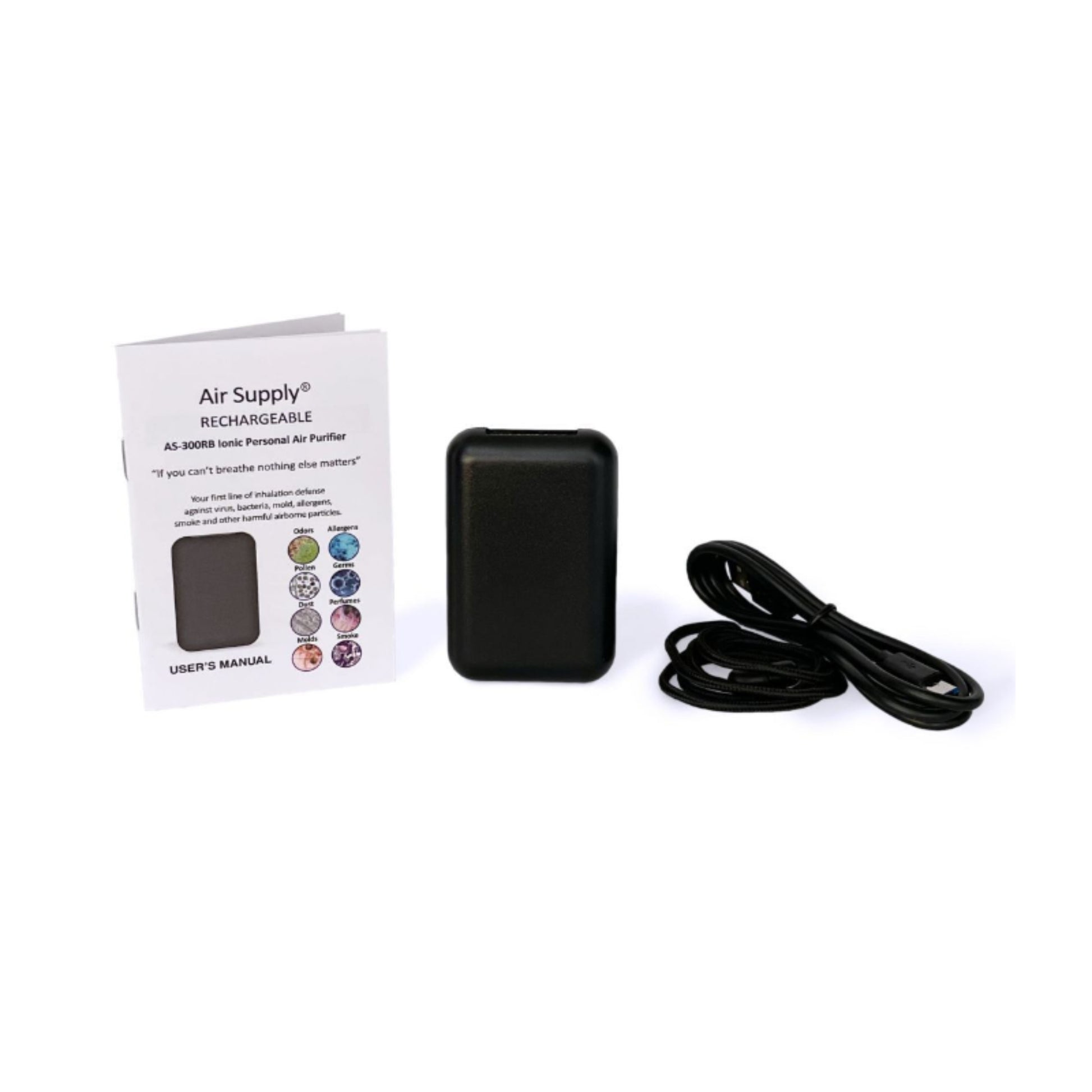 It’s finally here! The USB rechargeable Air Supply® AS-300RB. With 28 hours of run time per charge, this ultra light weight, wearable unit propels cleaner, fresher and healthier air into your personal breathing zone. Created especially to help sufferers who want to breathe more easily when they travel. Ounce for ounce the AS-300RB outperforms the competition and is top of the line in personal air purification. With an advanced plasma discharge design, the AS-300RB comes with solid platinum emitter and stainless steel grid. This Air Supply® Rechargeable also comes with a breakaway strap for user safety. Benefit from a decade of advanced research from the pioneer in ionic wearable air purification.